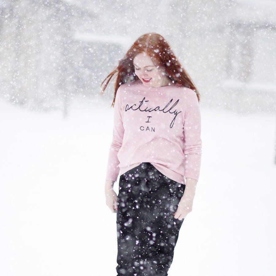 (Obviously ANOTHER good slogan for my sweater would be, “WHAT KIND OF IDIOT WOULD WEAR THIS IN THE SNOW?” Let the record show, though, that I didn’t actually go out like this, I just stepped outside the door for a couple of seconds to get a photo. Because, well, everyone else on Instagram was posting photos in the snow, and honestly, if everyone else on Insta jumped off a cliff, I’d be all, “BRB, folks, got a cliff to jump off right now…”)