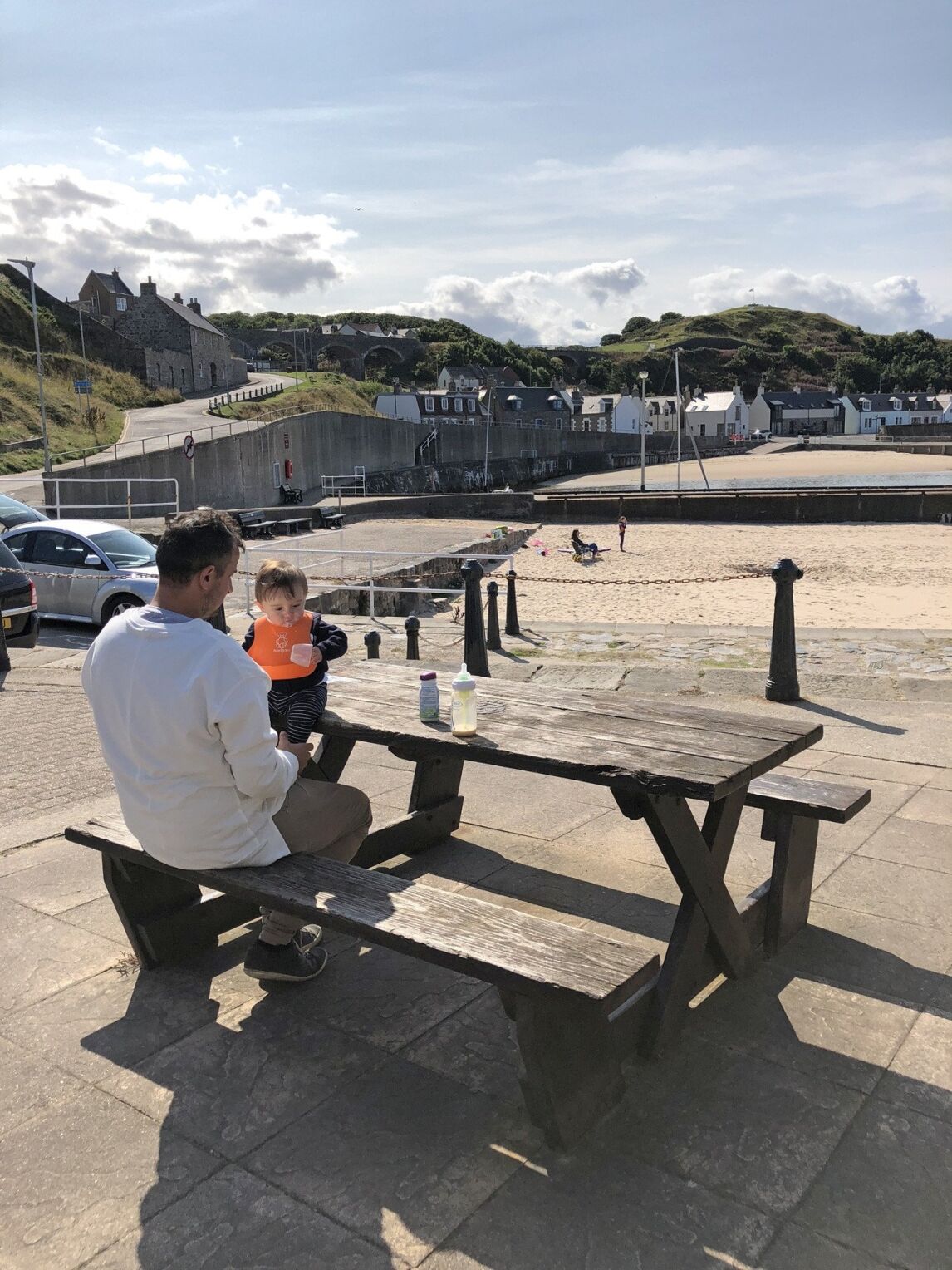Terry is absolutely fascinated by natural rock formations like this, and spent ages scrambling about on the pebble beach, taking photos. I, meanwhile, was just as enamoured by the little surrounding villages, like Portnockie itself, and nearby Cullen, which were picture-perfect, but in a way that apparently rendered me totally incapable of taking any perfect pictures, because, when I went through my camera roll to put this post together, here’s the only photo I could find, which depicts our ill-fated attempt to feed Max, on a bench in Cullen: