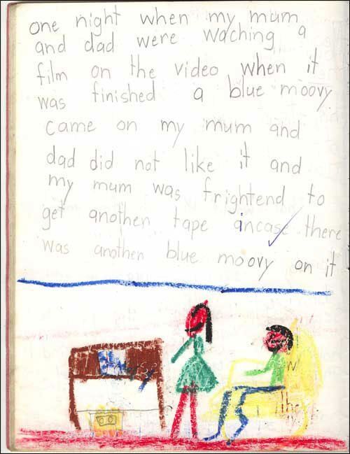 Luckily when the teacher asked me what a “blue moovy” was, I was quickly able to explain that it is a “moovy” in which everything is coloured blue. Obviously. And when my parents visited the school for parents evening that term, they were able to further clarify (at their own insistence, I have to add – the teacher by this point thought it was hilarious) that this “blue movie” had been as much of a surprise to them as it probably had been to my teacher, and that although the illustration suggests that I had been present during the screening of the infamous moovy (it almost feels like you’re there now, doesn’t it, so masterful was my command of the blue crayon…), I had, in fact, only found out about it because I overheard my mum telling my gran the story. Which I faithfully committed to writing in what I now think of as the very first version of this here blog, a document I spent most of Saturday re-reading and laughing until I cried.