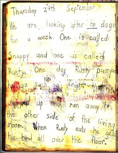 When I was a child, my parents would occasionally find themselves looking after two dogs. The dogs in question were brothers: Snoopy belonged to my mum’s parents and Rusty belonged to my dad’s parents, and if both sets of grandparents decided to take holidays at the same time, the dogs would come to us. This was, of course, a very great thrill for me, although not so much for my parents, who knew that every visit with the dogs would end with me writing this kind of thing in my News Book: