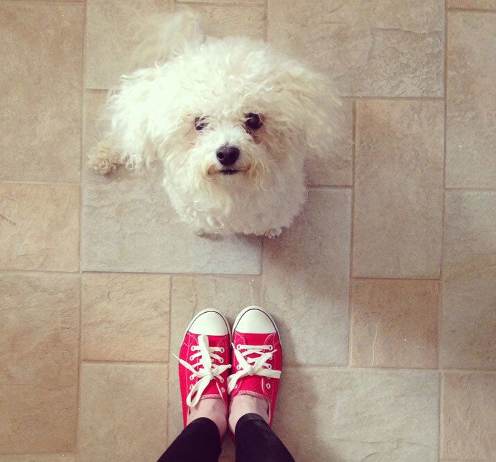 P.S. As I was about to publish this post, Terry said to me, “Do you want a photo of the cut for your blog?” I’ve turned him down on that one, so you get this cute photo of Rubin, plus a rare shot of me in sneakers, instead. (Don’t worry: those are my “I am doing work around the house” shoes – I haven’t forsaken my heels!) No need to thank me.